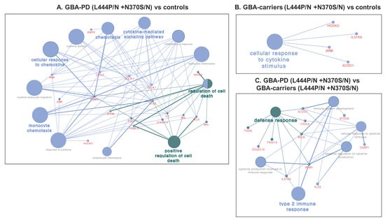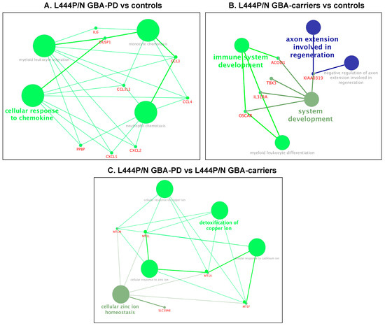 Networks of selected metabolic processes and DEGs in (A). L444P/N GBA-PD vs. controls; (B). L444P/N GBA carriers vs. controls; (C). L444P/N GBA-PD vs. L444P/N GBA carriers (obtained using CluePedia v. 1.5.7 + ClueGo v.2.5.7). (GBA-PD—Parkinson’s disease associated with mutations in the GBA gene; GBA carriers—asymptomatic GBA mutation carriers; DEGs—differentially expressed genes).