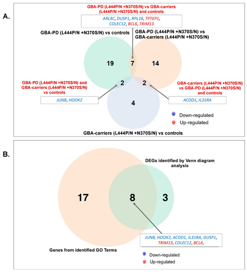 Venn diagram of (A). DEGs in monocyte-derived macrophages of L444P/N GBA-PD patients to controls compared to L444P/N GBA-PD patients to L444P/N GBA carriers, and compared to L444P/N GBA carriers and controls. B. DEGs determined be the Venn diagram in (B) and DEGs determined by GO analysis for L444P/N GBA-PD patients, L444P/N GBA carriers, controls. All data are presented as the number of genes with a p-value < 0.05 and |FC| more than 1.5. Three Venn diagrams were developed using the library VennDiagram (v.1.6.20) in R (v.4.0.3). (GBA-PD—Parkinson’s disease associated with mutations in the GBA gene; GBA carriers—asymptomatic GBA mutation carriers; DEGs—differentially expressed genes; GO—gene ontology).