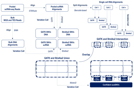 The analytical pipeline is presented in Figure 1. Our general strategy was to apply variant calling in parallel on the pooled and individual scRNA-seq alignments, in a setting that favors variant identification in the pooled data (relaxed or no filtering) over the individual (stringent quality filtering). We used three popular callers-GATK, Strelka2, and Mutect2, which have repeatedly demonstrated high-quality performance across both DNA and RNA sequencing data, including scRNA-seq data [6,7,14,15,16,30]. To retain the maximum number of identifiable SNVs in the pooled data, we applied GATK and Strelka2 in parallel, and then generated the union of the SNVs across WES, TES, and each of the 4 corresponding scRNA-seq datasets. To retain SNV calls with low VAFRNA, the variant calls were not filtered for the depth of allele coverage or confidence of the genotype call.
