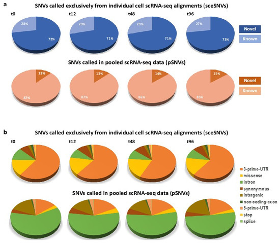 (a). Percentage of novel and known SNVs called exclusively in the individual alignments (sceSNVs, top) and in the pooled scRNA-seq data (pSNVs, bottom). An approximately 5-fold higher percentage of novel SNVs was seen in the individual cell alignments. (b). Distribution of functional annotations among the SNVs called exclusively in the individual alignments (top), as compared to the pooled scRNA-seq data (bottom). Significantly higher proportions of 3’-prime-UTR, missense and stop-codon SNVs were called in the individual alignments.