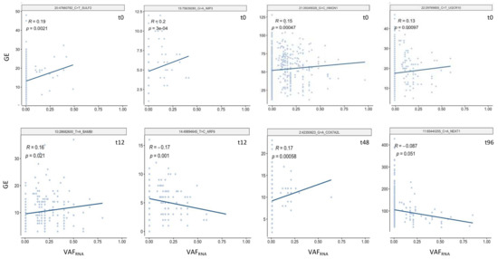 Finally, we assessed whether the expression of sceSNVs correlated with the expression of their harboring gene, for which we applied the linear regression model implemented in cis-scReQTL [11]. For this analysis, we used sceSNVs detected in five and more cells (between 35 and 70 sceSNVs per dataset). Across the four datasets, we identified a total of 20 cis-scReQTLs at a significance level of p < 0.05 (Figure 6 and Supplementary Figure S6). We indeed observed weak to moderate relationships, mostly due to the small number of cells expressing the variant SNV allele. This is expected for novel mutations, and also reflects the relatively small overall number of studied cells (1250–2887 cells per sample). We expect that by including a higher number of cells per sample, more recent and future scRNA-seq studies will enable improved correlation analyses.