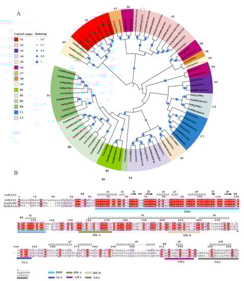 Heat shock transcription factors (Hsfs) are critical components in signal transduction networks that transcriptionally regulate genes responsive to diverse stresses; they are evolutionarily conserved throughout the eukaryotic kingdom [23]. In vertebrates, Drosophila and Caenorhabditis elegans, four, one and one Hsfs have been characterized, respectively [24]. In plants, Hsfs families were identified to have diverse gene numbers varying among species, with 21 in Arabidopsis, 25 in rice, 24 in tomato (Solanum lycopersicum) and 52 in soybean (Glycine max), respectively [23,25,26]. Moreover, Hsfs in plants shared a typical modular structure [23,27,28]. The N-terminal DNA-binding domain (DBD) features by a central helix-turn-helix that specifically recognizes and binds to the heat stress promoter elements (HSE) (5′-AGAAnnTTCT-3′). The oligomerization domain (OD or HR-A/B region) is linked to the DBD by a flexible linker of variable length. According to the length of the flexible linker and the structural characteristics of the HR-A/B region, Hsfs are assigned to A, B, and C classes. Class A Hsfs generally function as transcriptional activators that are mediated by the C-terminal short activator peptide motifs (AHA motifs), while typical repressor domains are found in class B Hsfs. In addition, the nuclear localization signal (NLS) for nuclear import and the nuclear export signal (NES) for the receptor-mediated nuclear export are also present in Hsfs.