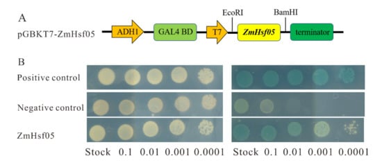 3.4. ZmHsf05 Has Transactivation Activity in Yeast