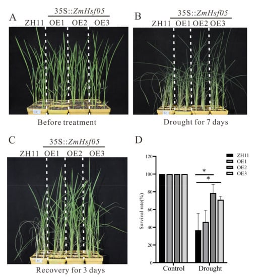 Drought tolerance analysis of rice with ZmHsf05 overexpression in soil. Three transgenic rice ZmHsf05 overexpression lines (OE1, OE2, and OE3) and wild-type ZH11 were cultured in soil. Rice were grown for three weeks at normal conditions (A), the watering was stopped and the drought treatment was carried out for 7 days (B). After the appearance of the phenotype, we re-cultivated the rice seedlings by watering them for 3 days (C). (D) Statistics of the survival rate of overexpression lines and WT after drought treatment. Vertical bars indicate means ± SEs (n = 3). *, p < 0.05 (Student’s t-test).