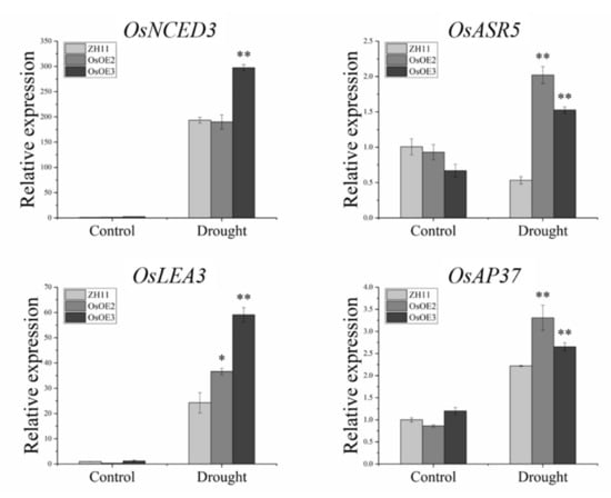 Expression analysis of ABA-related and drought-related genes in transgenic rice after drought treatment. Three biological replicates were used for each experiment. The OsActin-1 gene was used as the internal control for normalization. Vertical bars indicate means ± SEs (n = 3). *, p < 0.05; **, p < 0.01 (Student’s t-test).