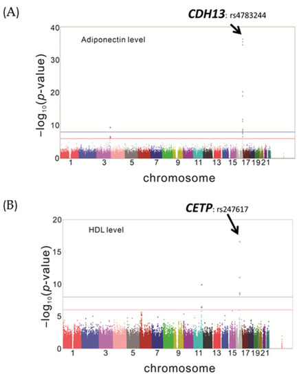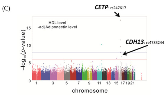 One of the limitations of this research is that we did not check HMW adiponectin, particularly as T-cadherin has been recognized as an adiponectin-binding protein with a preference for HMW adiponectin. Furthermore, the SNPs in CDH13 are more strongly associated with HMW compared with total adiponectin. Therefore, further research is required to examine the correlation between the CDH13 SNPs and HDL-C with respect to HMW adiponectin levels. Another limitation was that the sample size used for the GWAS analysis in this study was medium. Future studies will need to employ larger-scale GWAS to obtain stronger p values for the suppression effect.
