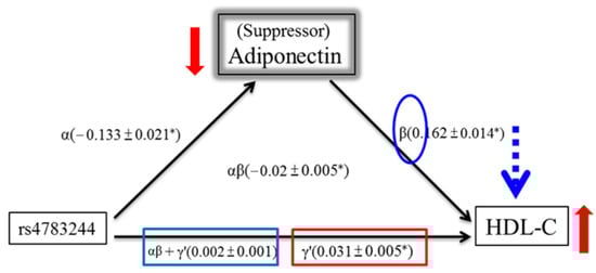 We discovered that several SNPs in the 5′-UTR of CDH13 were significantly associated with HDL-C after adjustment for adiponectin levels. This report is in line with those from a previous study [10]. In the current study, we successfully applied the mediation model and conducted mediation analysis of the CDH13 lead SNP rs4783244, confirming that adiponectin exerts a suppression effect on the association between CDH13 and HDL-C levels. As summarized in Figure 3, since the carriers of the minor genotype T express low adiponectin levels (red arrow), we hypothesize that the association between the CDH13 genotype T and HDL-C is suppressed by adiponectin due to the positive correlation (blue circle) between adiponectin level (red arrow) and HDL-C level (red arrow). This reduces the HDL-C level (blue arrow) and, therefore, masks the significant association (red square) between the CDH13 genotype T and HDL-C into non-significance (blue square).