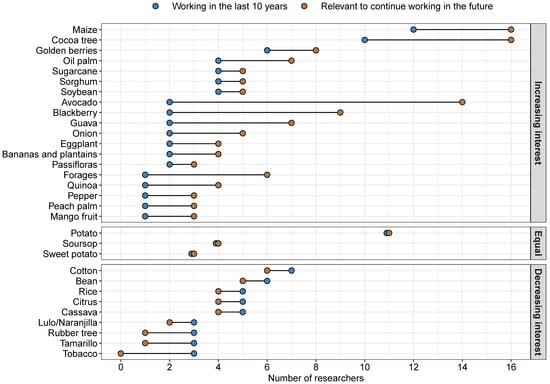 List of crops worked on by surveyed Agrosavia researchers in the last ten years (blue dots) and those considered relevant to continue working with in the future (yellow dots). Past and future research interests show three distinct patterns: crops with increasing interest for future work (increasing interest), crops with similar interest historically and in the future (equal), and crops with decreasing interest in the future (decreasing interest).