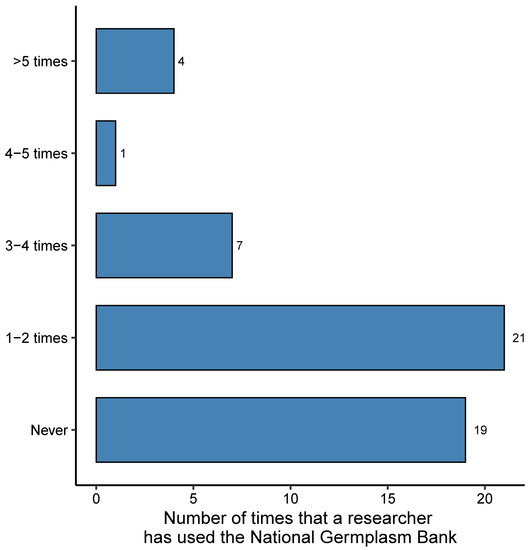 Although the National Germplasm bank conserves 26 of the 31 species (84%) from the list in Table 2, the survey showed that this germplasm bank, also administered by Agrosavia, is not the primary focus of pre-breeding and breeding programs. A total of 37% (n = 19) of the researchers have never used the germplasm bank, and 40% (n = 21) have used it only once or twice in the last ten years (Figure 4). As a result, only 17% of the new varieties released since 2012 has at least one parent from an accession conserved in the National Germplasm bank (i.e., 8 new varieties of 69 registered) (Table 1, Supplementary Table S2).