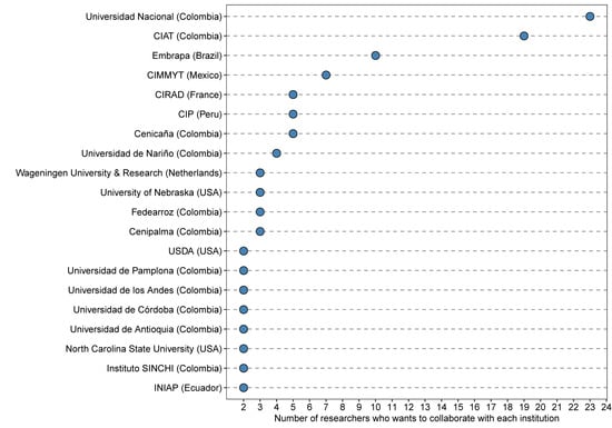 The number of researchers working on plant breeding and plant genetic resources from Agrosavia interested in starting collaborative breeding initiatives with each national and international research institution and university listed. In parenthesis is the country where each institution is located.