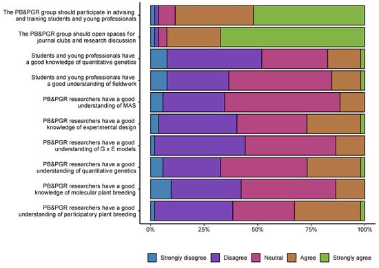 List of ten statements on challenges and opportunities associated with research in plant breeding and plant genetic resources within Agrosavia. The color bars represent the opinion of the 52 researchers surveyed, indicating in percentage the number of researchers who responded with each level of agreement for each statement. The categories from left to right are: strongly disagree, disagree, neutral, agree, strongly agree.