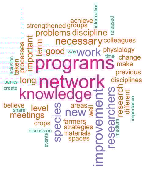 Graphic representation of a word cloud analysis of the 52 opinions about improving the plant breeding and plant genetic resources group in Agrosavia.