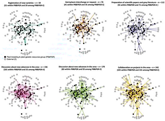 The six types of interactions among 50 researchers from the plant breeding and plant genetic resources group (PB&PGR) in black and 117 externals (including other disciplines within Agrosavia and outside institutions) (E) in grey. The six types of interactions are listed from the lowest number of total connections in the top left to the highest number of total connections in the bottom right. The number of interactions for researchers within the PB&PGR group and for researchers between the PB&PGR and externals is given in parentheses for each interaction type. The dots represent the researchers (i.e., vertex in the network), and the lines represent the interactions (i.e., edges in the system).