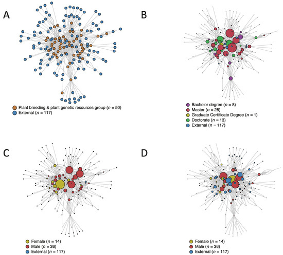 Graphical representation of the network analysis of 50 researchers working in plant breeding and plant genetic resources in Agrosavia and 117 externals (including researchers from other disciplines within Agrosavia and outside institutions). (A) Distribution of researchers (nodes) and their interactions (edges) separating the 50 researchers from the PB&PGR group and the 117 externals. (B) Characterization of researchers (nodes) by the degree score (i.e., size of the circle) and highest academic degree (i.e., color). The degree score indicates the number of adjacent direct interactions with other researchers. (C) Characterization of researchers (nodes) by the hub score (i.e., size of the circle) and gender (i.e., color). The hub score measures the ability of a researcher to make a relation with other influential researchers (i.e., authorities). (D) Characterization of researchers (nodes) by the authorities score (i.e., size of the circle) and gender (color). The authority score indicates the number of links of interactions that a researcher earned. Therefore, authority researchers should have relevant information on the field and receive more links from other researchers.