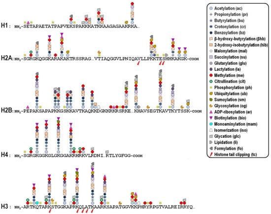 Diagrammatic representation showing the distribution of post-translational modifications within the N- and C-terminal portions of the five canonical histones. The first amino acid methionine was omitted from the sequences. Key for each histone PTM is included in diagram. Reference sequences of histone proteins were retrieved from the NCBI protein database (https://www.ncbi.nlm.nih.gov/protein?cmd=retrieve; accessed on 2 October 2021) using the following accession numbers: NP_005313.1 (H1), NP_003504.2 (H2A), NP_066406.1 (H2B), NP_003520.1 (H3), and NP_003529.1 (H4).