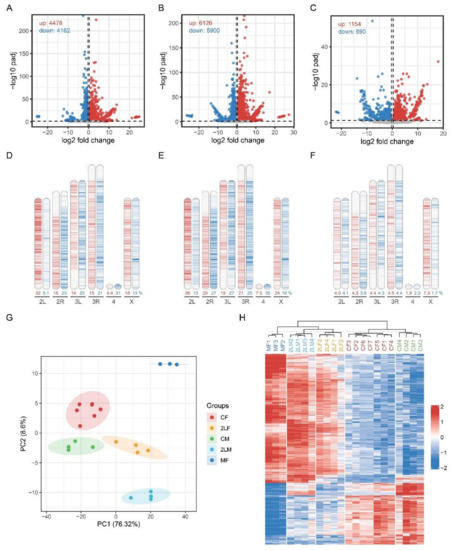 Overview of the differentially expressed genes (DEGs) in three kinds of aneuploidy. (A–C) Volcano plots of DEGs in trisomy 2L female (A), trisomy 2L male (B) and metafemale (C) compared with normal diploid of the corresponding sex. DEGs are defined as adjusted p-value < 0.05 and fold change >1.25 or <0.8. (D–F) Density heatmaps of the distribution of DEGs along Drosophila chromosomes in trisomy 2L female (D), trisomy 2L male (E) and metafemale (F). The red bands represent up-regulated genes, and the blue bands represent down-regulated genes. The darker colors show a greater density of DEGs. The number below the chromosomes indicates the percentage of up- or down-regulated genes in the total number of genes in this chromosome. (G) Principal component analysis (PCA) plot of all aneuploidy samples and control groups. The circles represent 95% confidence intervals. (H) Heatmap of all aneuploidy samples and control groups. CF, wildtype female control; CM, wildtype male control; 2LF, trisomy 2L female; 2LM, trisomy 2L male; MF, metafemale.