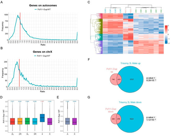 Effect of inverse regulator Inr-a/pcf11 on global gene expression. (A,B) Ratio distributions of Inr-a duplication male compared with wildtype male. Genes are divided into autosomes (A) and X chromosome (B) according to their positions. The X-axis indicates the ratio of expression, and the Y-axis indicates the frequency of the ratios that fall into each bin of 0.05. The red solid line represents the ratio of 1.00 which means no change in gene expression. (C) Heatmap of common differentially expressed genes in Inr-a duplication male and trisomy 2L male compared with wildtype male. CM, wildtype male control; 2LM, trisomy 2L male; Pcf, Inr-a duplication male. (D,E) Boxplots of ratios in Inr-a duplication male compared with wildtype male. Genes are divided into each chromosome (D) or autosome and sex chromosome (E) according to their positions. The numbers at the top of the boxplots indicate the median, blue represents down-regulation and red represents up-regulation. (F,G) Venn diagrams show the number of up-regulated (F) or down-regulated (G) genes in Inr-a duplication male and trisomy 2L male. DEGs are defined as adjusted p-value < 0.05 and fold change >1.25 or <0.8 in trisomy 2L male, and adjusted p-value < 0.05 in Inr-a duplication male. Fisher’s exact test p values are shown beside the Venn diagrams.