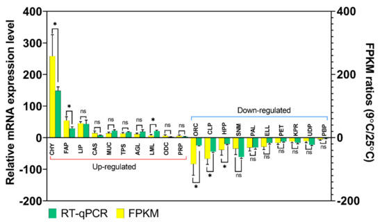 Differentially Expressed Genes (DEGs) validation by RT-qPCR in comparison to corresponding folding change (FC) data detected in RNA-Seq. Relative genes expression (T9/T25) is shown as the ratio of them per rpl32. Each treatment includes three technical replicates. Asterisks above standard deviation bars indicate significant difference between groups at Type I error = 0.05 (LSD test). The letter ‘ns’ stands for a non-significant difference between groups.