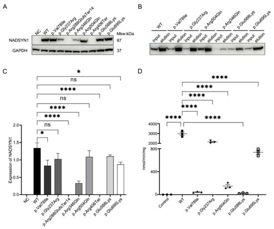 Then SDS-PAGE and Western blot analysis were conducted on whole cell lysates by standard methods. A rabbit anti-His-tag antibody (1:1000, AE068, ABclonal, Wuhan, China) was used as the primary antibody and goat anti-rabbit horseradish peroxidase-conjugated secondary antibody (ab6721, Abcam, Cambridge, MA, USA) was applied to detect WT and mutant protein expression levels. Then, the cell lysates were re-probed with horseradish peroxidase-conjugated anti-GAPDH antibody (ab9482, Abcam, Cambridge, MA, USA). NADSYN1 and GAPDH expression level were visualized by automatic chemiluminescence imaging system (C300, Azure Biosystems, Dublin, CA, USA). Then quantification of band intensity was performed by ImageJ (National Institutes of Health, Bethesda, MD, USA). Overall expression levels of WT and mutant NADSYN1 were normalized to GAPDH levels, respectively. Statistical comparisons were conducted with the GraphPad Prism software using the one way ANOVA. Each experiment was repeated three times. p-Values < 0.05 (*) were considered statistically significant.