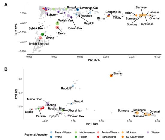 Despite different genotyping platforms and population sampling, the results from the current study recapitulate earlier breed relationships made by Lipinski et al. [5] and Gandolfi et al. [9]. The array resolved breeds with Southeast Asian, Western, and Persian origins. The current study also shows the distinctiveness of the Birman breed. Elsewhere, this uniqueness was attributed to genetic profile derived from a single extended Birman pedigree; however, the cats used in the current study had no discernible familial relationships (Figure A1). Moreover, the PCA appears to support its relationship with the Ragdoll, which is purportedly derived from crosses with the Birman [43].