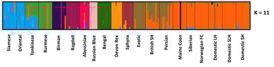 Population structure was also investigated using the variational Bayesian framework implemented by fastSTRUCTURE [33]. Analysis from K = 2 to K = 30 was conducted on both the balanced dataset and the full dataset. Analysis by fastSTRUCTURE using the balanced dataset produced a more defined output with a model complexity maximizing marginal likelihood of K = 10 and K = 11 for model components used to explain structure in the data (K∅c statistic in fastSTRUCTURE). This suggests that K = 11 is the minimum number of populations that have a cumulative ancestry contribution of at least 99.99% (Figure 2 and Figure A5). At K = 2, Southeast Asian breeds like the Oriental and Siamese separated, with other breeds following suit with increased K (Figure A5). At K = 11, Siamese and Oriental cats were not resolved; this is not unexpected as the Oriental cat is a Siamese in all but colour. It was developed in the 1950s, when Siamese were crossed with different cats including Russian blues, British shorthairs, DSH, and Abyssinians, then crossed back to Siamese cats [39]. The Ragdoll also has its own cluster and there appears to be a cat from the Ragdoll cluster in the Birman group (the same cat also evidenced in the PCA data). The Tonkinese are very clearly admixed with Siamese and Burmese, as expected given their derivation from these breeds [40]. DSH, DLH, and DSLH could not be resolved from the Maine coon, Siberian, and Norwegian forest cats. Admixture with these cats appears elsewhere, notably among Persian and British shorthair (who by PCA cluster closely with the DSH, DLH, and DSLH in our balanced dataset PCA). Regardless of K tested for the balanced dataset, DSH, DLH, and DSLH cats remained homogeneous (Figure A5).
