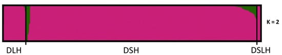 - Raj, A.; Stephens, M.; Pritchard, J.K. fastSTRUCTURE: Variational Inference of Population Structure in Large SNP Data Sets. Genetics 2014, 197, 573–589. [Google Scholar] [CrossRef] [PubMed] [Green Version]