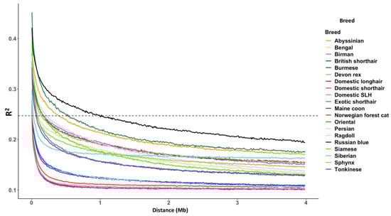 Decay of LD is typically rapid among outbred populations. To assess this, the study used the balanced dataset (Figure 4). Overall, the random-bred cats, DSH, DLH, and DSLH had the most rapid rates of LD decay, followed closely by the Norwegian forest cat. In contrast, the Oriental, Russian blue, and Abyssinian had the slowest rates of LD decay. Following the Norwegian forest cat’s rapid LD decay were the British shorthair, Persian, and Maine coon cats. The Siberian differed from other breeds in that LD initially decayed rapidly to below R2 = 0.17 within 1 Mb, but then remained relatively stable thereafter. This observation is perhaps reflective of a breed in the making: in its native Russia, Siberian cats are likened to an old regional variety of random-bred cats. Elsewhere, this cat is rare, and its selective breeding is a recent phenomenon; the first Siberian cats officially reached the UK in 2002; since then the number of UK breeders has increased rapidly [41].