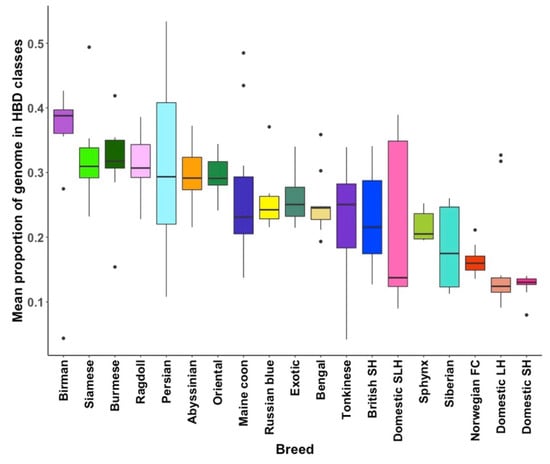 A boxplot diagram representing the mean proportion of each breed’s genome partitioned into HBD segments. On average, random-bred (i.e., DSH, DLH, DSLH) cats have the lowest proportion of their genome in HBD segments, whilst the Birmans had the highest proportion of their genome in HBD segments.