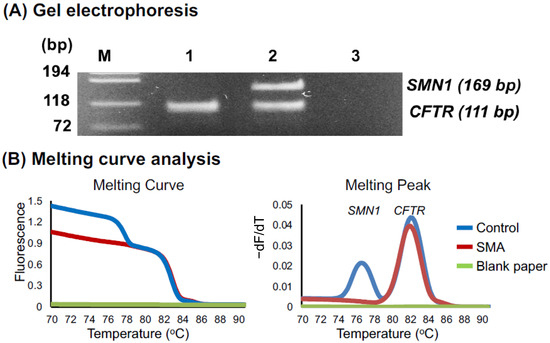 Detection of SMN1. (A) Agarose gel electrophoresis of the second-round PCR products indicating the SMN1 band (169 bp) and the CFTR band (111 bp). Lanes M, 1, 2, and 3 represent the DNA ladder, SMA patient, healthy control, and blank paper, respectively. (B) Melting curve and melting peak analysis to detect SMN1/CFTR in a healthy DSS (blue line), an SMA DSS (red line), and a blank paper (green line).