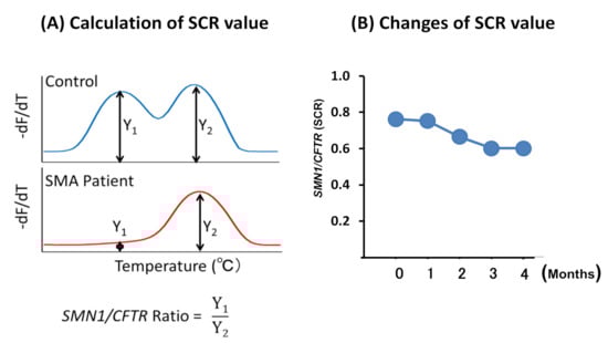 The SMN1/CFTR peak ratio (SCR) value. (A) The formula to calculate SCR. (B) The changes to the SCR value over the month(s).