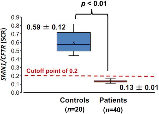 The SCR value ranges of controls and SMA patients were far apart and did not overlap in this study. An SCR value of 0.2, however, was tentatively set as the cutoff point showing the absence of SMN1. This tentative cutoff point was less than −3 SD of healthy control values, 0.23.