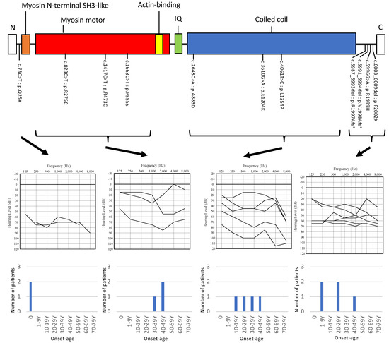 Domain structure of MYH14, identified variants, the overlapping audiograms from the better-hearing ear, and onset-age distribution for the patients with each domain variant. Domain structures are indicated based on UniProtKB (Q7Z406). Orange: Myosin N-terminal SH3 like domain, Red: Myosin motor domain, Yellow: Actin binding domain, Green: IQ domain, Blue: Coiled coil domain.