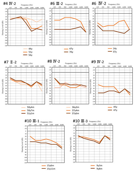 Anamnestic evaluation of the 11 probands and 6 of their family members was also performed, and 12 were conscious of the progression of deafness (Table 1). Figure 3 shows serial audiograms for eight patients from six families. The audiograms for the better-hearing ear were used to evaluate progression. The patients who were observed for more than 10 years showed clear progression (Family No. 4 IV-2, Family No. 6 III-2, and Family No. 6 IV-2). Family No.9 IV-2 also showed hearing progression over two years. The observation periods for Family No. 7, No. 8, and No. 10 were too short to allow evaluation of progression (5 months to 16 months).