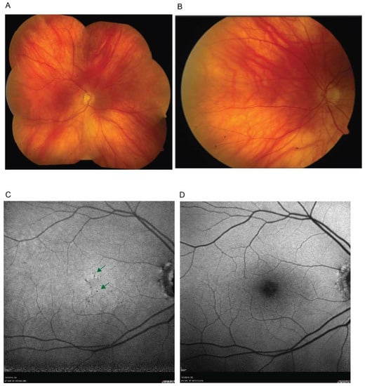 En face retinal imaging demonstrating retinal findings. (A). A color fundus photography photomontage shows a normal blonde fundus. (B) A magnified image of the central retina demonstrates small faintly depigmented round lesions (green arrows) near the foveal center. (C,D). Fundus autofluorescence imaging using near-infrared (NIR-FAF) (C) and short-wavelength (SW-FAF) (D) excitation lights. Arrows on the NIR-FAF image (C) points to round dark, hypo-autofluorescent, depigmented lesions; SW-FAF image (D) is within normal limits. Only right eye shown for clarity, left eye had similar findings.