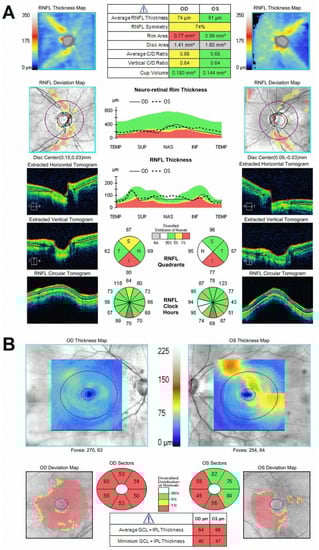 Optic nerve and retinal photography by OCT demonstrating vertical optic nerve atrophy with associated thinning in the retinal ganglion cell layer. SD−OCT of the peripapillary and central retina in the WDR36-positive patient. (A) SD−OCT of the peripapillary retina in the patient. Sides (left and right columns) are plots of the topography of the peripapillary RNFL thickness as raw thickness values (top row) and as deviation maps (second row) compared to a normative database for the right (left panels) and left (right panels) eyes of the patient. The bottom three rows of panels below are horizontal (top) and vertical (middle) cross-sections SD−OCT scans through the optic nerve, as well as circular scans cross-sectional tomograms around the optic nerve. The middle column is summary parameters. (B) SD−OCT of the central and pericentral retina in the patient. Top panels are topographic maps of the GCL thickness (there are segmentation artifacts shown as localized thickened GCL in the left eye). Bottom panels are GCL thickness summary parameters compared to a normal distribution database.
