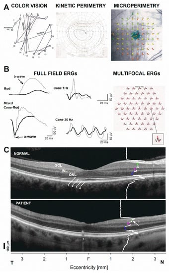 Detailed phenotyping revealed a deutan−tritan defect on Farnsworth D15 color vision testing (Figure 3A). Goldman kinetic visual fields were normal in peripheral extent with a minor superior depression while fundus perimetry demonstrated an unsteady central fixation associated with reduced foveal sensitivities as well as and deep arcuate defects in nasal pericentral retina most dense inferiorly which co-localized with the areas of GCL and RNFL thinning that tracked to the peripapillary retina (Figure 3A). Electrophysiologic testing was pursued to try to find an explanation for the central vision loss. The b-wave of the full-field electroretinogram (ffERG), which reflects the function of the inner retina, particularly bipolar cell function, were markedly reduced in amplitudes and delayed in timing for rod- and cone-mediated recordings (Figure 3B). These inner retinal abnormalities in the light-adapted ERG conferred a particularly abnormal configuration compared to the normal waveforms. By contrast, the photoreceptor-mediated a-wave was perfectly normal for cone- and dark-adapted responses (Figure 3C). Multifocal electroretinograms (mERG) confirmed this pattern of predominantly inner retinal dysfunction. The abnormalities led to a comprehensive genetic screening including of 856 genes, which revealed a c.1064 A > C pN355S pathogenic variant in WDR36. A central SD-OCT was performed to explore the structural correlate to these retina-wide functional abnormalities (Figure 3C). A location 2 mm in the nasal retina was chosen. Measurements were obtained at 2 mm from the foveal center where there was only minimal lateral displacement of the inner retina in relationship to the distal photoreceptors from which they received their input. Longitudinal reflectivity profiles were used to ensure proper segmentation of the main nuclear layers. Significant GCL thinning and a borderline thin INL with otherwise normal photoreceptor ONL was documented, consistent with the mainly inner retinal abnormalities detected by electroretinography (Figure 3C). The findings partially recapitulatde the findings in an animal model of WDR-associated retinal degeneration [].