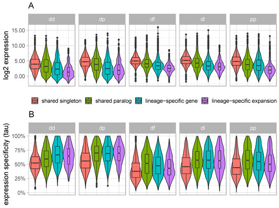 Gene expression distributions across gene categories for each of five dictyostelid species (listed in Table 1). Violin plots of (A) gene expression (log2 TPM) and (B) expression specificity (tau) for shared singletons (red), shared paralogs (green), lineage-specific genes (blue), and lineage-specific expansions (purple). dd: Dictyostelium discoideum; dp: Dictyostelium purpureum; df: Dictyostelium fasciculata; dl: Dictyostelium lacteum; pp: Polysphondylium pallidum.
