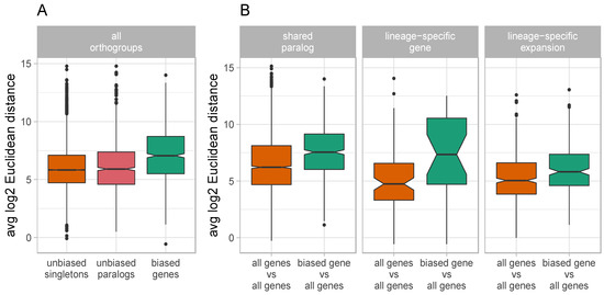 Expression divergence of duplicate genes. Boxplot of the average gene expression divergence between genes among orthogroups, as calculated using log2 Euclidean distances for (A) unbiased genes and biased genes, and for (B) paralogs across different gene categories.