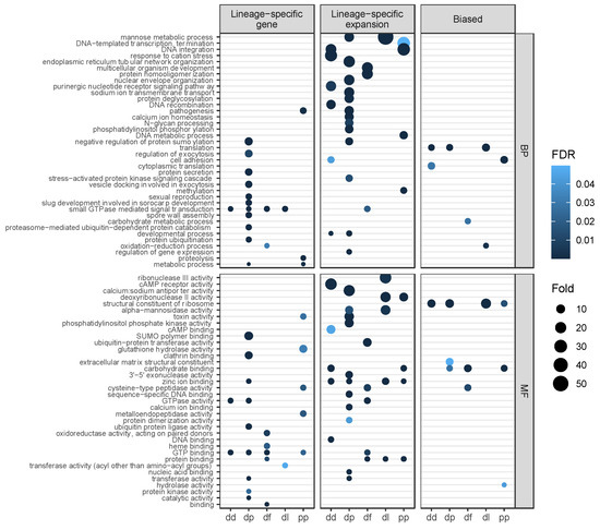Gene ontology enrichment terms across categories. Dot plot of enriched GO terms across species for lineage-specific genes, lineage-specific expansions, and all biased genes for Biological Processes (BP) and Molecular Functions (MF). The size of the dot represents the fold difference in observed terms versus expected, and the darker the dot the lower the FDR-corrected topGO weighted p-value.