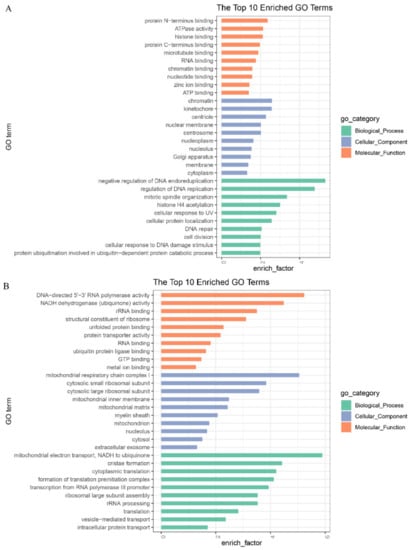 GO enrichment of (A) up-regulated DEGs and (B) down-regulated DEGs with the top 10 terms in biological process, cellular component, and molecular function.