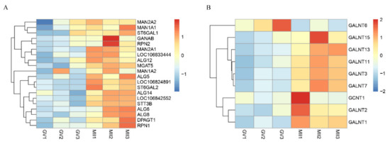 Expression of glycosylation genes. (A). Heat map representation of DEGs belonging to the selected N-Glycan biosynthesis enriched by up-regulated DEGs. (B). Heat map representation of DEGs belonging to the selected mucin-type O-Glycan biosynthesis enriched by all DEGs.