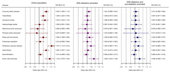 Mendelian randomization estimates (odds ratios with 95% confidence intervals) for cardiovascular outcomes per 2-fold increase in genetically predicted risk of type 2 diabetes mellitus. Analyses were performed in 367,703 UK Biobank participants of European ancestries, and in subsets of participants without diabetes, and participants without diabetes or pre-diabetes.
