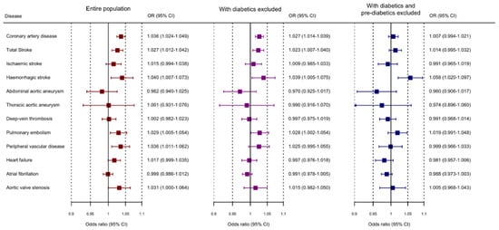 Mendelian randomization estimates (odds ratios with 95% confidence intervals) for cardiovascular outcomes per 1 mmol/mol increase in genetically predicted HbA1c levels. Analyses were performed in 367,703 UK Biobank participants of European ancestries, and in subsets of participants without diabetes, and participants without diabetes or pre-diabetes.