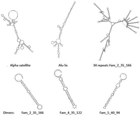 Predicted 2D structure of satellite RNAs. In the upper row, we present the structure of a single repeat of human α satellite (NCBI code: DAAF01000002.1), one Alu sequence, and 34 repeats of one C. elegans satellite. In that case, the 34 repeats are not identical, they present minor variations. In the lower row we present the structure of two repeats of three different C. elegans satellites; all of them have an approximate duplex conformation, similar to the structures found in micro and short RNAs, as discussed in the text.