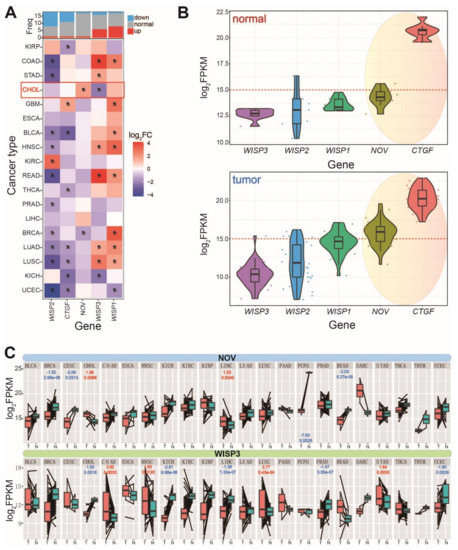 Pan-cancer analysis of expression pattern of CCN gene family. (A) Expression distributions of homologous genes in the CCN gene family. * indicates significantly deregulated genes (|log2FC| > 1.5, padj < 0.05). (B) Expression patterns of five genes in normal and tumor samples in CHOL. (C) Paired analysis of deregulated NOV and WISP3 across diverse cancer types. The abnormally expressed genes are presented (|log2FC| > 1.2, padj < 0.05 for paired analysis).