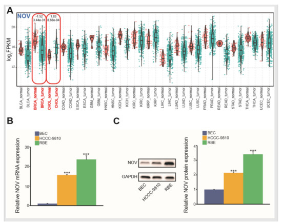 Expression analysis and experimental validation. (A) Pan-cancer analysis of screened NOV across cancer types based on tumor and normal samples. The red circled part means that there are significant difference on the expression of NOV in BRCA and CHOL (Tumor vs. Normal) (B) NOV mRNA expression based on the q-PCR method. *** indicates p < 0.001. (C) NOV protein expression based on Western blot. *** indicates p < 0.001.