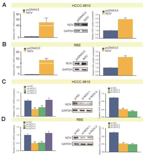 Overexpression and silencing of NOV in HCCC-9810 and RBE. (A). Expression efficiency of NOV mRNA (left) and protein (right) in HCCC-9810. (B) Expression efficiency of NOV mRNA (left) and protein (right) in RBE. (C) Gene silencing of NOV mRNA (left) and protein (right) in HCCC-9810. (D). Gene silencing of NOV mRNA (left) and protein (right) in RBE. All experiments are repeated three times independently, and the data are analyzed by t-test, ** indicates p < 0.01, *** indicates p < 0.001.