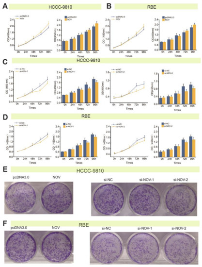 Cell viability test was performed in triplicate using a commercially available kit (Cell Counting Kit-8, CCK-8) (Tokyo, Japan). The cells were diluted to single-cell suspension and then seeded into 96-well plates (1 × 103 cells/well) with 100 µL culture medium. After 12 h incubation, the cells were treated with siRNAs (100 nm) or NOV overexpression vector (1000 ng) for 48 h. At the time point (0, 24, 48, 72, and 96 h), CCK-8 solution (10 µL) was added to each well and incubated for 3 h. The cell viability was calculated as absorbance of solutions that were detected at 450 nm with a microplate reader (Epoch, Biotech, Winooski, VT, USA). The results were represented as an average of five parallel samples. All related experiments were repeated at least three times.