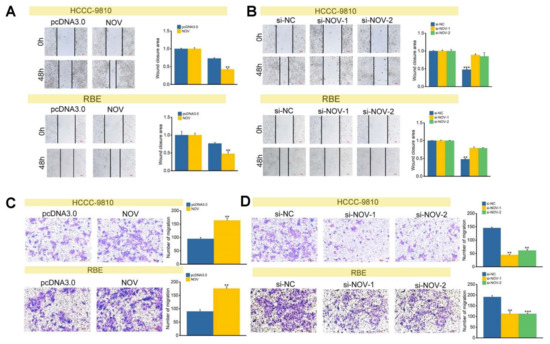 NOV promotes the migration of ICC cells. (A) The effect of NOV overexpression on cell migration via wound healing assay. (B) The effect of NOV silencing on cell migration via wound-healing assay. (C) The effect of NOV overexpression on cell migration via transwell migration (100×). (D) The effect of NOV silencing on cell migration via transwell migration (100×). ** indicates p < 0.01 and *** indicates p < 0.001.
