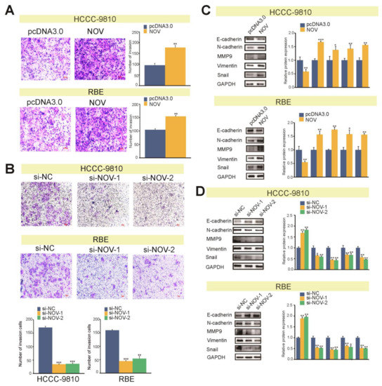 To further verify the invasive role of NOV, overexpressed plasmids were transfected into HCCC-9810 and RBE cells, and a transwell invasion assay was performed after 48 h. Similar to migration results, overexpression of NOV could promote ICC cell invasion abilities (Figure 6A), whereas NOV silencing could impair their the invasion abilities. These findings proved confirmed that NOV could promote invasion ability of cells, indicating the potential role of NOV in cancer pathology (Figure 6B). Furthermore, Western blot analysis revealed showed that NOV overexpression could down-regulate E-cadherin, an epithelial marker protein, and simultaneously up-regulate vimentin, N-cadherin, Snail and MMP9 (Figure 6C). However, NOV silencing could up-regulate E-cadherin and down-regulate vimentin, N-cadherin, Snail and MMP9 (Figure 6D). As a result, NOV overexpression could promote the EMT process, while NOV silencing could suppress it.